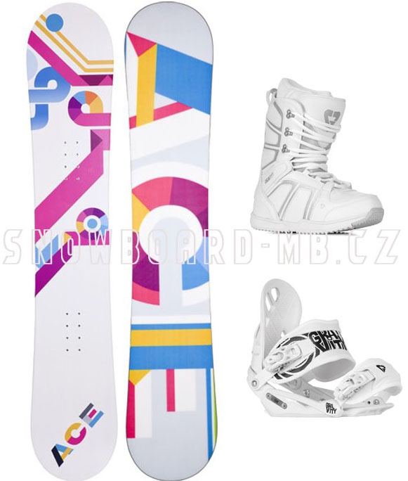 Dámský snowbordový komplet obsahuje prkno značky ACE, vázání a boty značky Gravity pro rok 2012/2013.